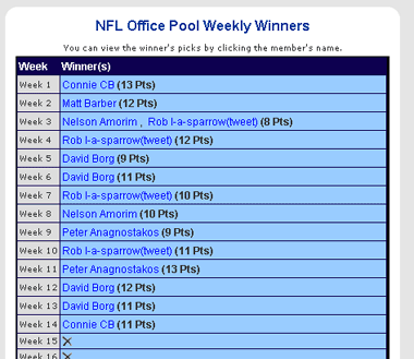 Your group has the added bonus of keeping track of your pool's weekly winners. Your group admin can choose to either allow ties or turn on the tiebreaking option allowing only one weekly winner.